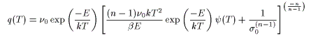 q(T)は脱離速度、ν0は頻度因子、D0は振動項、σ0は初期の分子の数、C0は初期濃度、nは反応次数、dは薄膜の厚さ、Eは活性化エネルギ、kはボルツマン定数、βは昇温速度、Tは絶対温度です。ψ(T)はアレニウスの式を積分したときに導かれる級数です。
