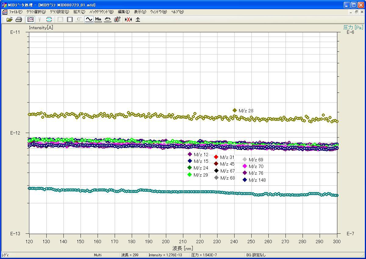 PETは2重結合で構成されているため、脱離成分がありません。注目した質量数はもちろん、分析チャンバーの圧力も変化しておらず、脱離成分がないことが確認されます。