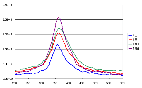 2.試料調整後、2日、7日、14日、28日経過したSiチップを昇温脱離実験(昇温速度=60K/sec)します。