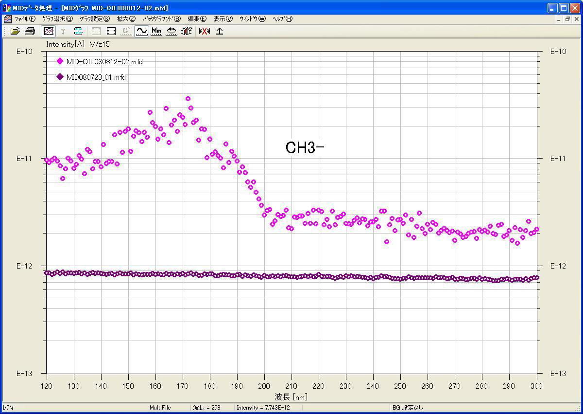 この実験は、光脱離分析装置の得意分野「有機物上の有機物の分析」を実証するために行いました。例として、PET上のオイルによる汚染を分析しています。 下図はPETの室温時の光脱離データです。
