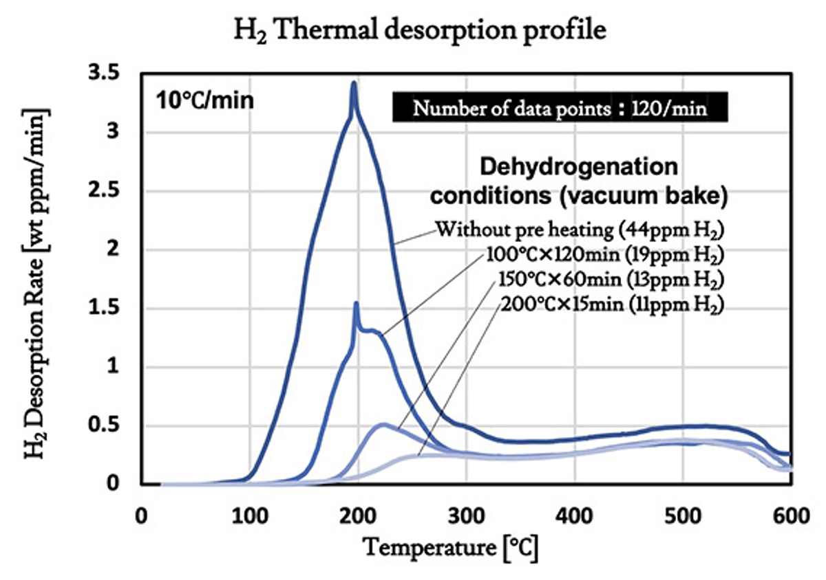 グラフは以下の4つの条件における水素放出プロファイルを比較しています。カッコ内の数値は測定時の総放出水素量であり、言い換えると「各脱水素処理後にニッケルめっき皮膜に残った水素量」を表しています。