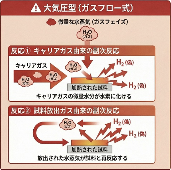 一般的なガスフロー方式では、フローガスや試料から放出されたガスと試料が反応し「試料由来ではない水素」が発生する可能性があります。