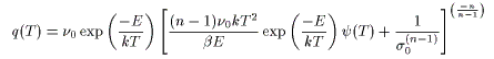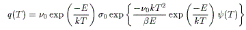 q(T)は脱離速度、ν0は頻度因子、D0は振動項、σ0は初期の分子の数、C0は初期濃度、nは反応次数、dは薄膜の厚さ、Eは活性化エネルギ、kはボルツマン定数、βは昇温速度、Tは絶対温度です。ψ(T)はアレニウスの式を積分したときに導かれる級数です。