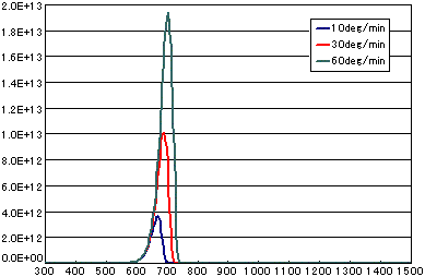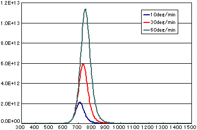活性化エネルギー、頻度因子(振動項)、脱離成分の初期分子の数、昇温速度などのパラメータによって、信号形状やピーク温度などが変わります。